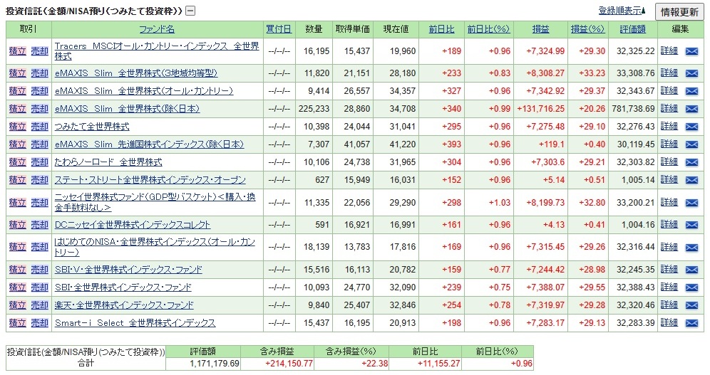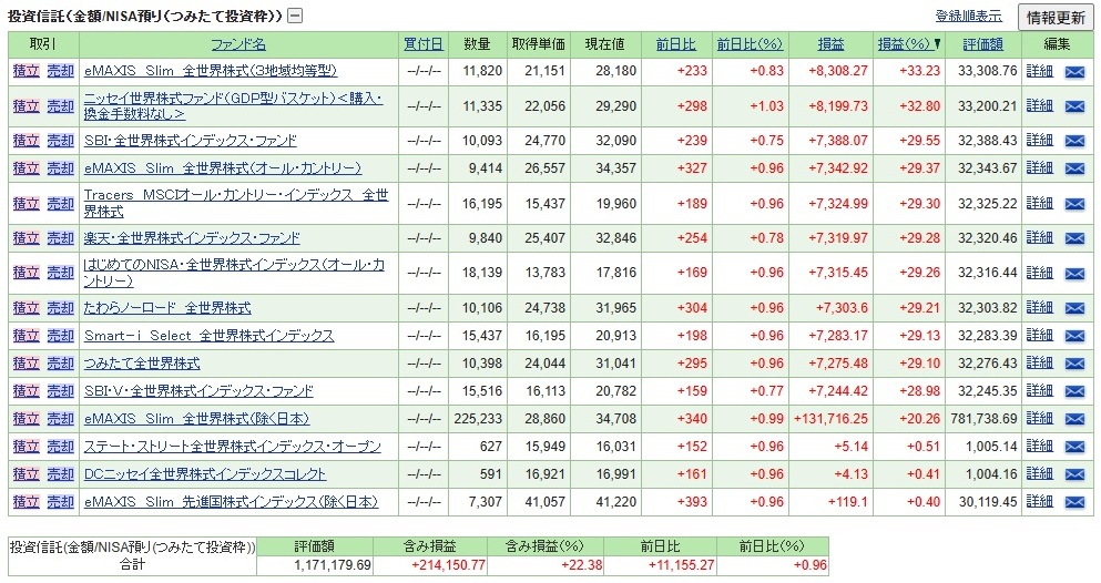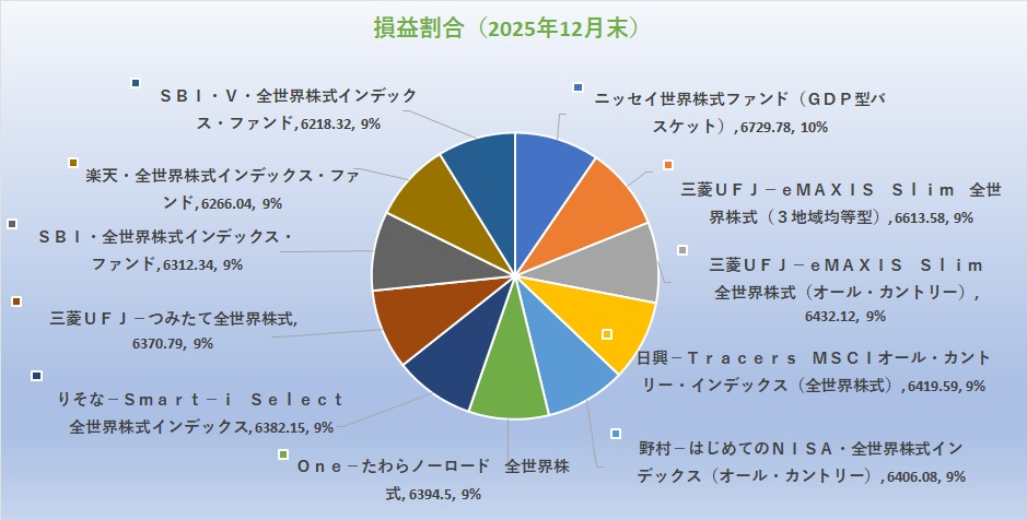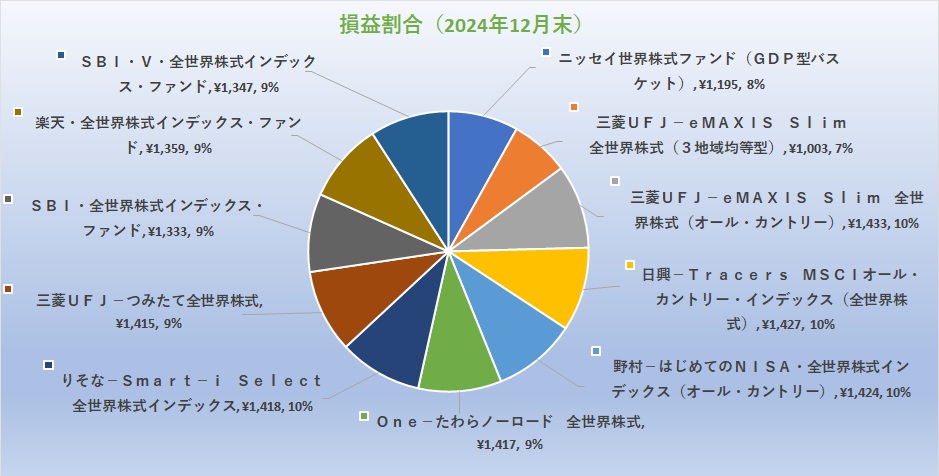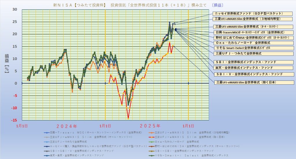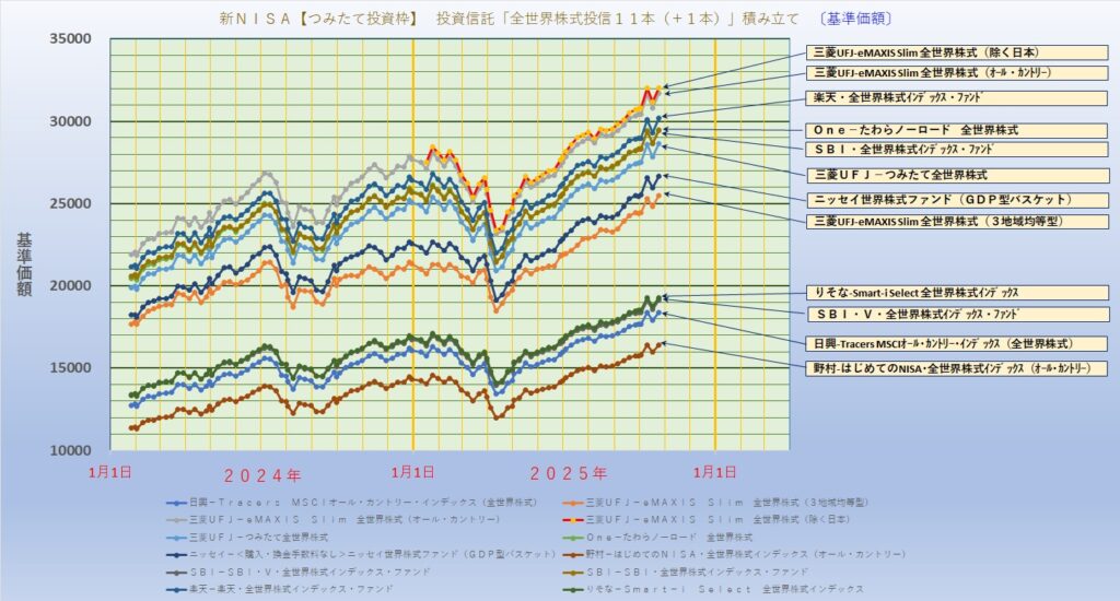 ●新NISAのつみたて投資枠を使って、全世界に分散投資する投資信託11本(+1本)を積み立てします。