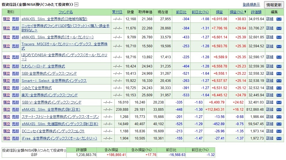 ⇒さらに2026年から追加で33,000円積立てることにしました。追加購入する投資信託は「ステート・ストリート全世界株式インデックス・オープン」と「DCニッセイ全世界株式インデックスコレクト」及び「iFree 全世界株式インデックス(オール・カントリー)」を1,000円づつ。「eMAXIS Slim 先進国株式インデックス(除く日本)」を3万円とします。