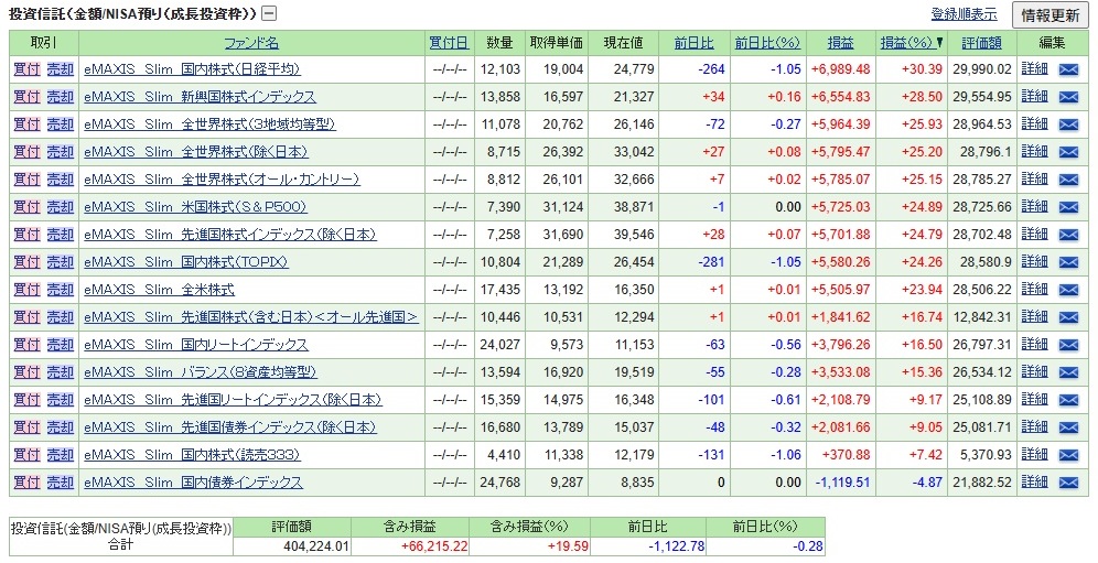 | eMAXIS Slim 先進国株式(含む日本)<オール先進国> | 0.09889%以内 | MSCIワールド・インデックス(配当込み、円換算ベース) | 2025年1月から積み立て |